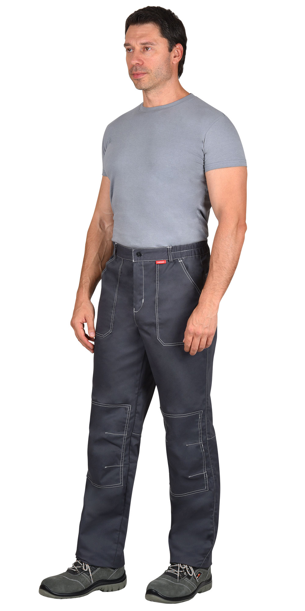 Брюки с застежкой спереди на однозамковую тесьму молния и на одну обметанную петлю и пуговицу на поясе; с различными многофункциональными карманами; обьемными наколенниками; с притачным поясом, частично стянутым резинкой по бокам.
