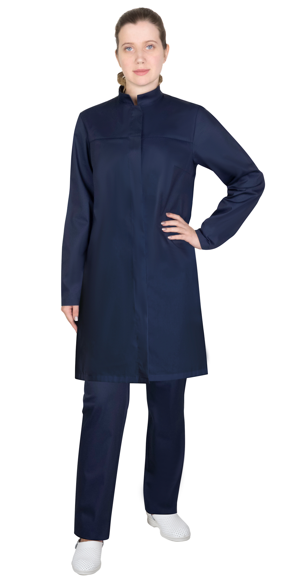 Халат для пищевого производства женский. Полуприлегающего ситлуэта на кокетке с рельефными швами по полочке и шлицей на спинке. Центральная застежка полочек, втачной воротник стойка. Рукав длинный втачной регулируемый по низу.