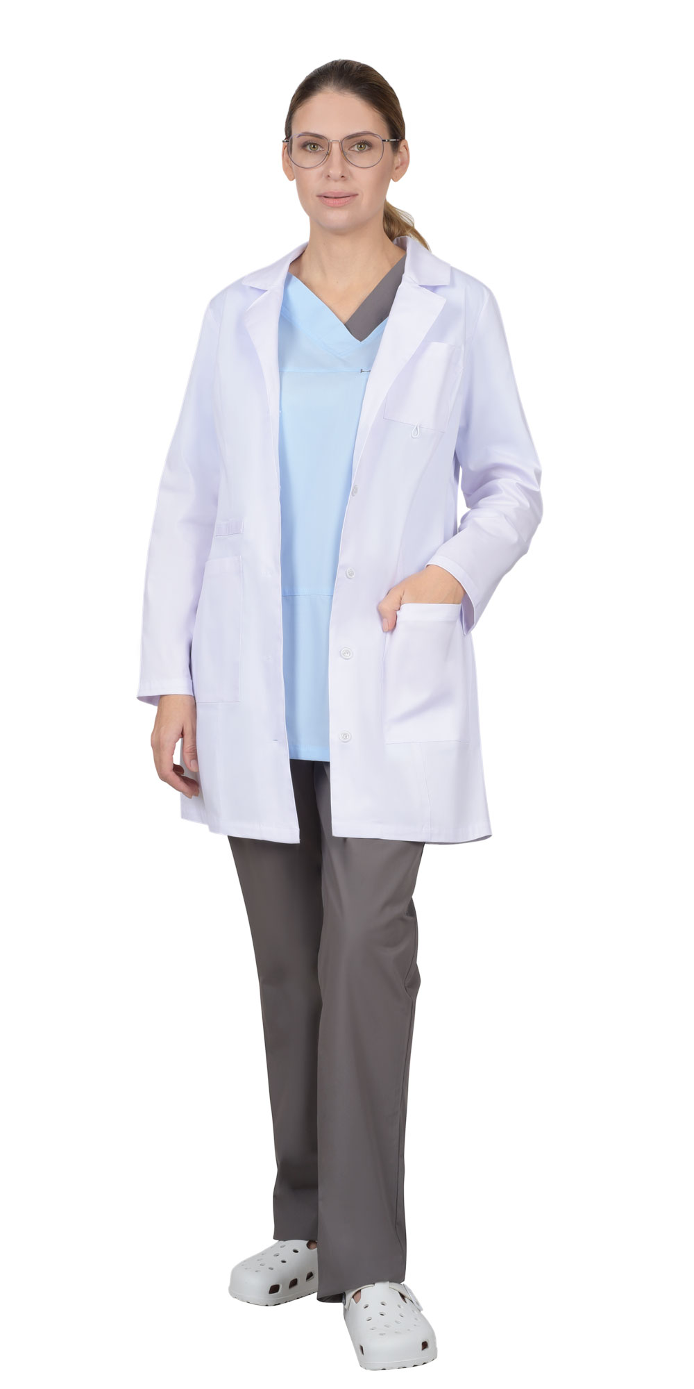 Описание:Халат женский полуприлегающего силуэта с центральной бортовой застёжкой на петли и пуговицы. Отложной воротник с лацканами. Один нагрудный и два нижних накладных кармана. Рукава втачные длинные. |