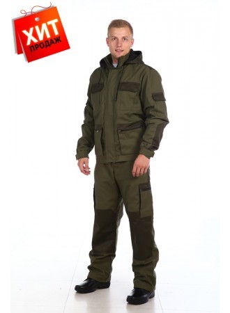 Брюки прямые с боковыми и накладными карманами с клапанами, притачным поясом на резинке. Усилительные накладки в области колен и локтей из непромокаемой ткани, талия и низ брюк на резинке.