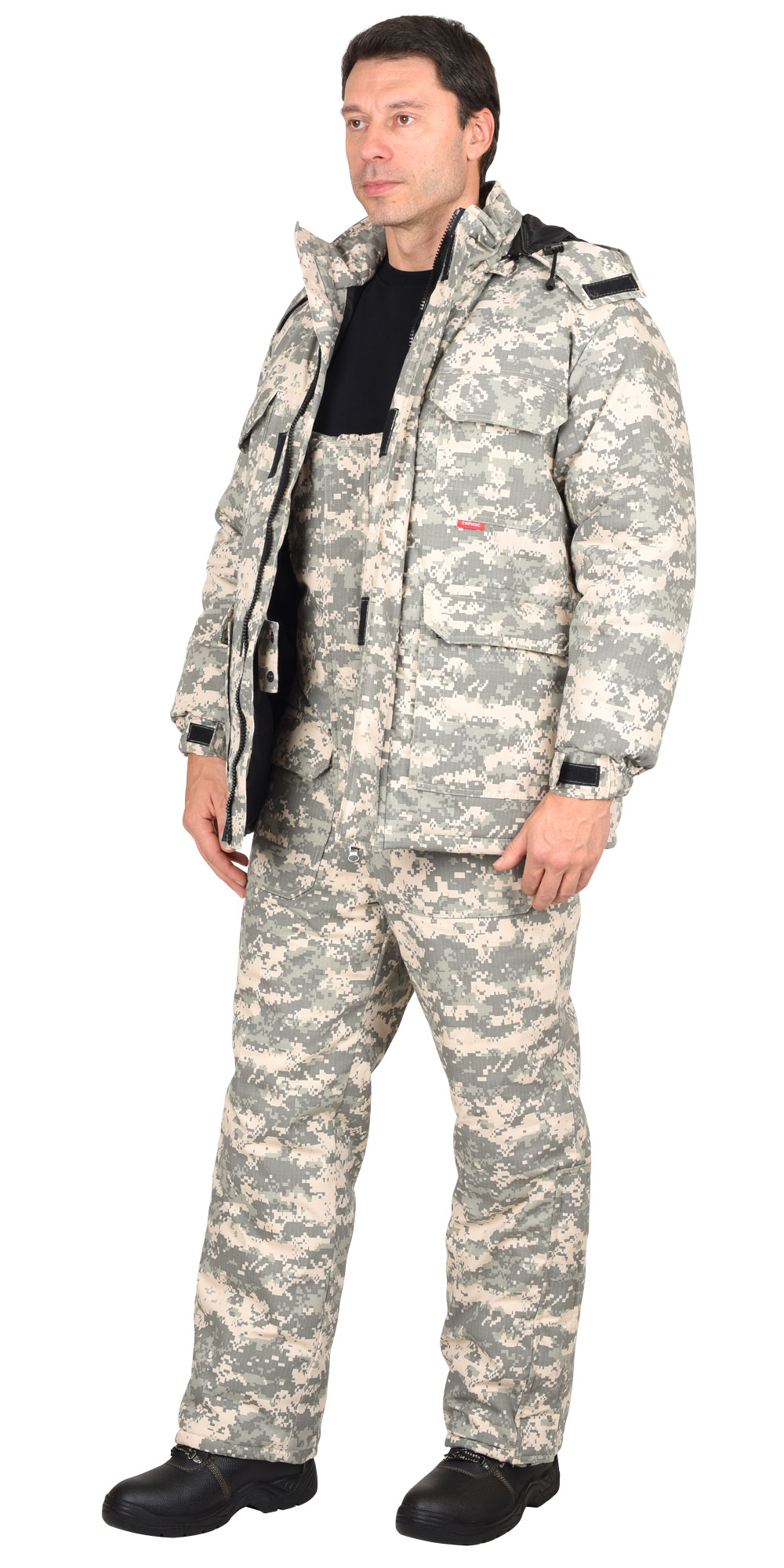 Куртка прямого силуэта, с притачной утеплённой подкладкой, с центральной застёжкой на двух замковую тесьму-«молнию», 1-м внутренним и 1-м внешним ветрозащитным клапаном, с воротником-«стойка», утеплённым пристёгивающимся капюшоном, верхними накладными карманами и нижними накладными двойными карманами с клапанами с застёжкой на «липучки». Рукава с манжетами с патой на липучке.