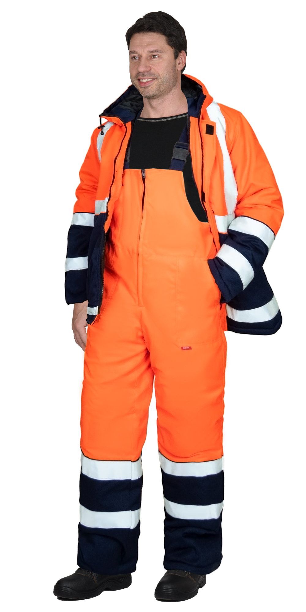 Костюм зимний, утеплённый, состоит из удлинённой куртки и полукомбинезона. Костюм двухцветный, основная ткань сигнальная повышенной видимости, также предусмотрена светоотражающая полоса мелкодисперсная белая ш.50 мм, что обеспечивает видимость рабочего при любом освещении.